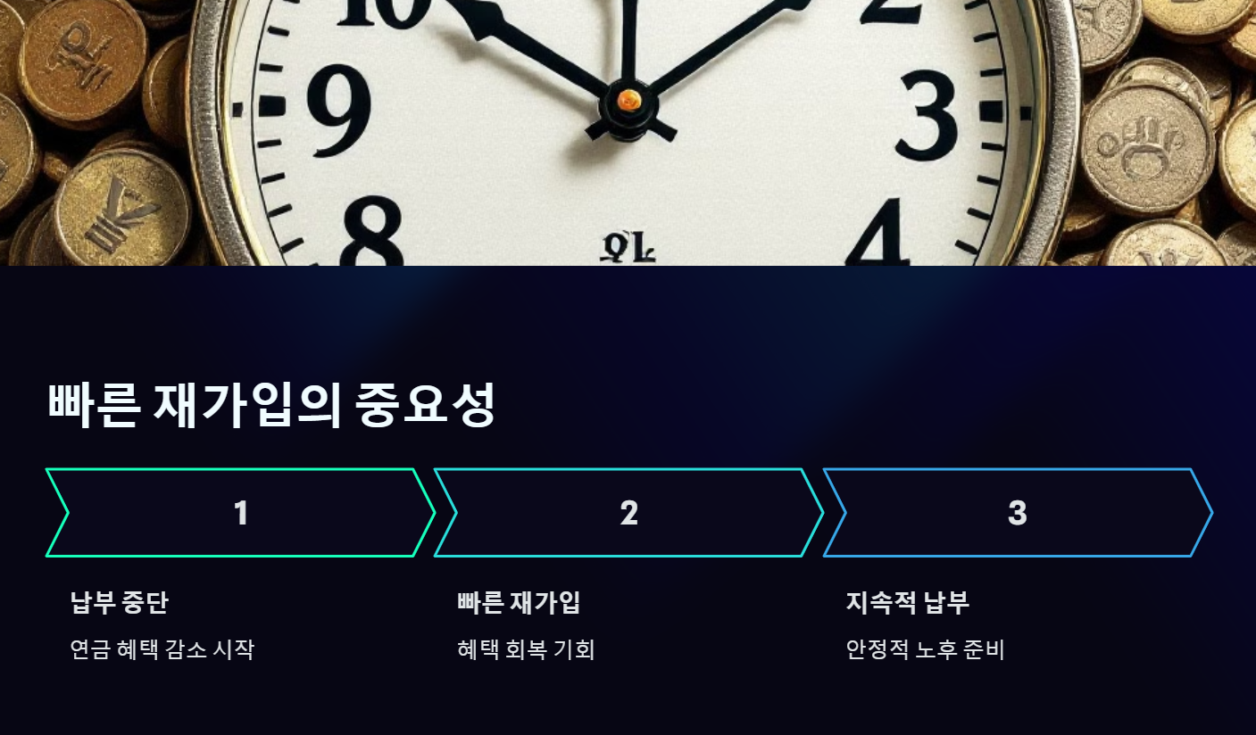 국민연금 납부를 중단한 경우, 다시 가입하는 시점을 최대한 앞당기는 것이 중요합니다. 국민연금은 납부 기간과 금액에 따라 혜택이 달라지기 때문에, 빠르게 재가입하여 납부를 재개하는 것이 장기적으로 더 큰 혜택을 받을 수 있는 방법입니다. 중단 기간이 길어질수록 수령액이 줄어들 가능성이 크므로, 가능한 한 빠르게 재가입하는 것이 유리합니다.