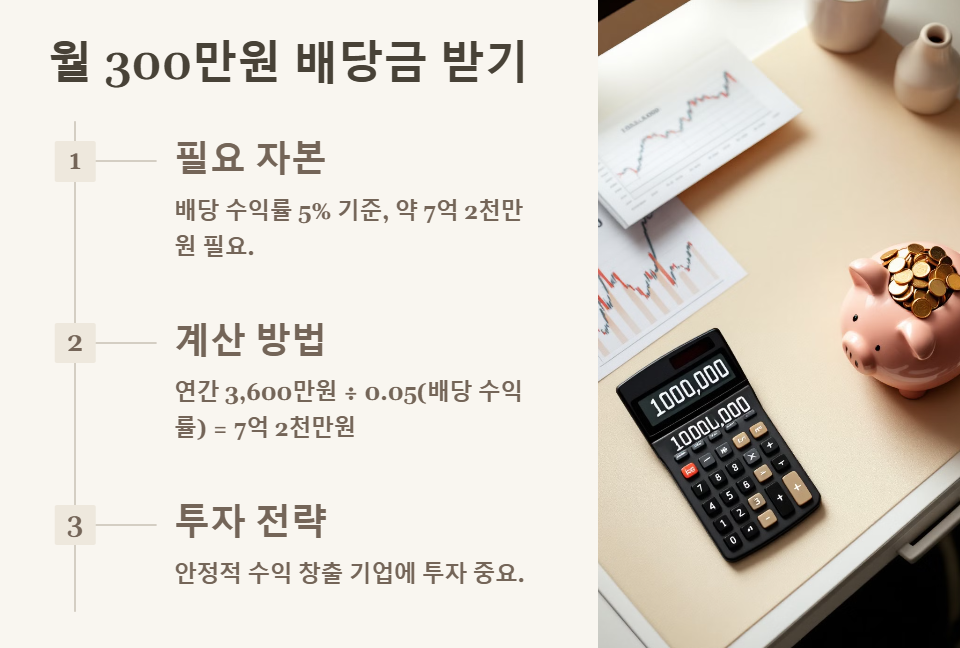 - 연간 필요한 배당금: 300만 원 × 12개월 = 3,600만 원